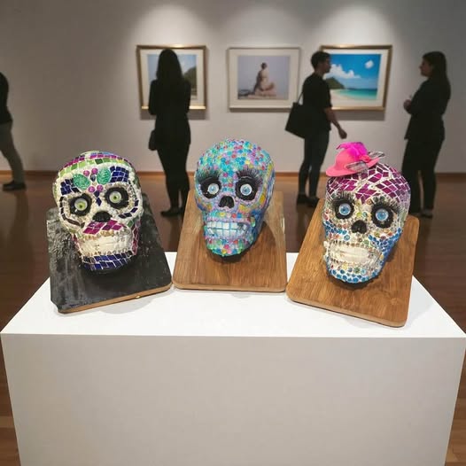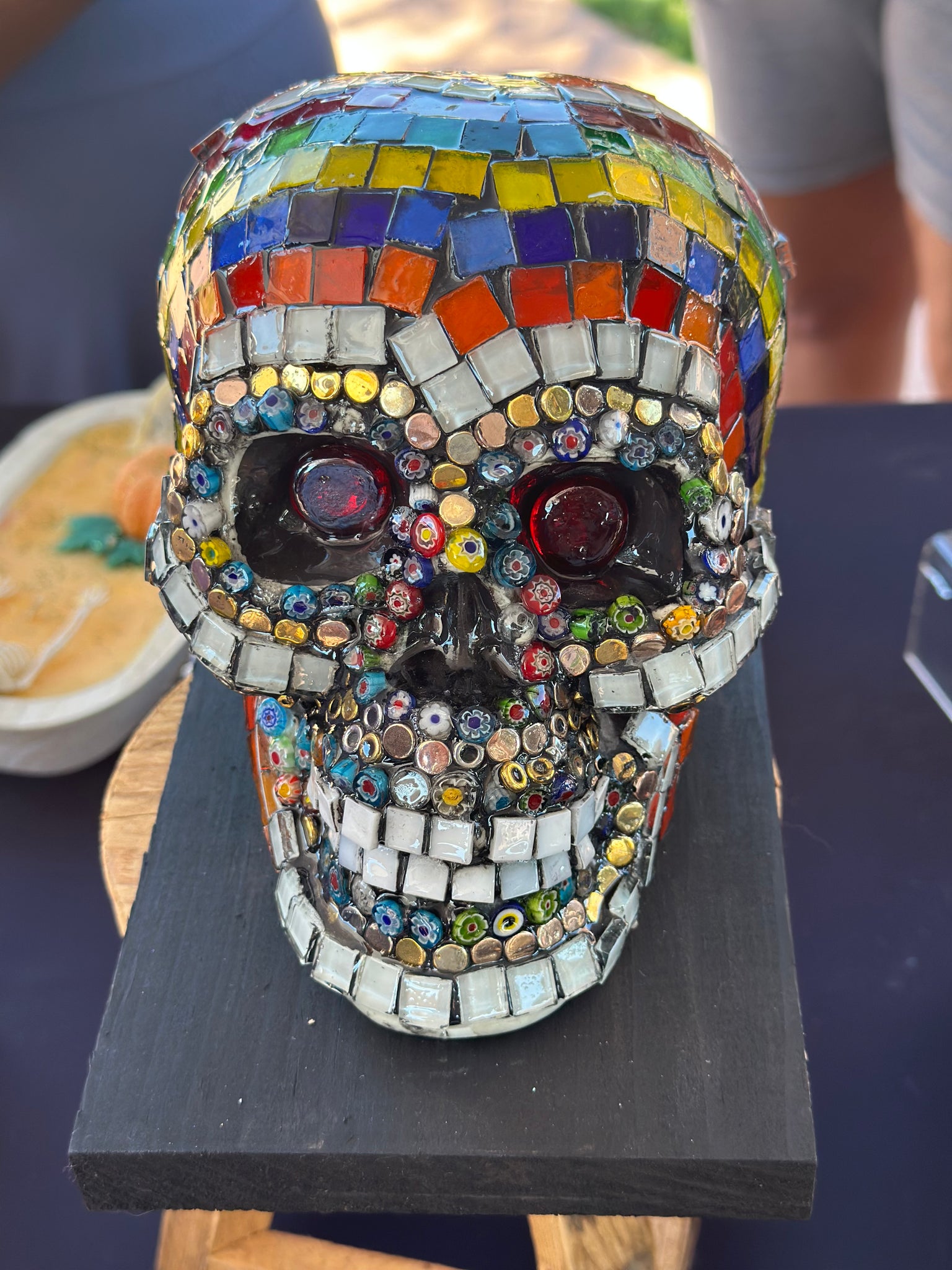 This is a skull that has been mosaiced to create this one-of-a-kind piece. It includes hundreds of glass tiles and is finished with resin.